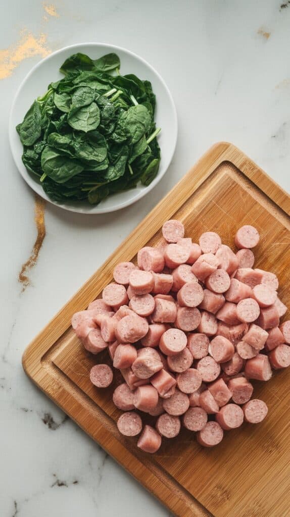 Dice 2 fully cooked chicken sausages into small bite-sized pieces. Roughly chop 1 cup of fresh spinach.