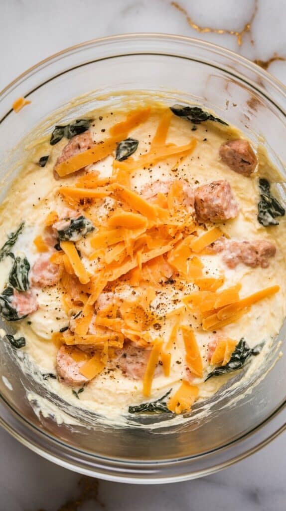 Stir in diced chicken sausage, chopped spinach, ½ cup shredded cheddar cheese, ¼ teaspoon garlic powder, ¼ teaspoon salt, and ¼ teaspoon black pepper. Mix gently until everything is evenly combined.