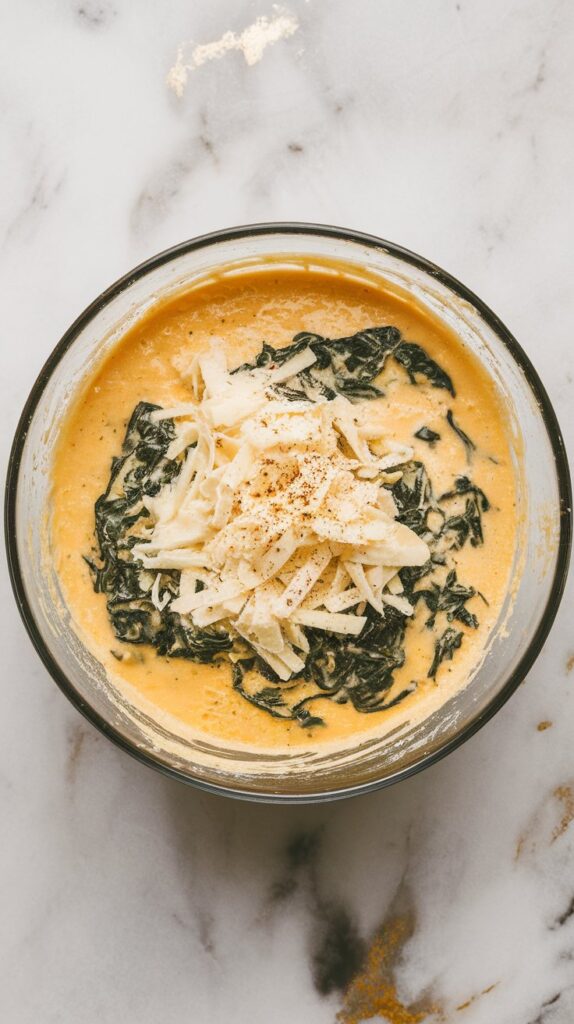 Stir in 1/4 cup shredded mozzarella, 1/4 cup chopped spinach, 1/4 tsp salt, and 1/8 tsp black pepper. Mix gently until evenly combined.