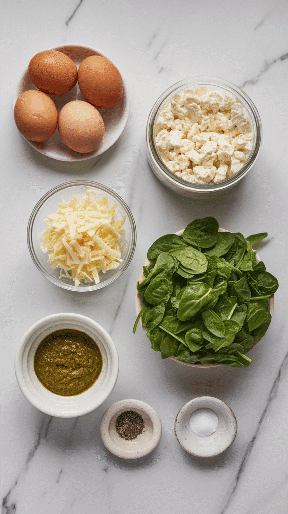 Cottage cheese blends into the eggs and makes the texture extra soft and creamy without any heavy cream. Pesto adds fat and flavor, while spinach brings moisture and nutrients. Baking them in a muffin tin helps portion control and even cooking.