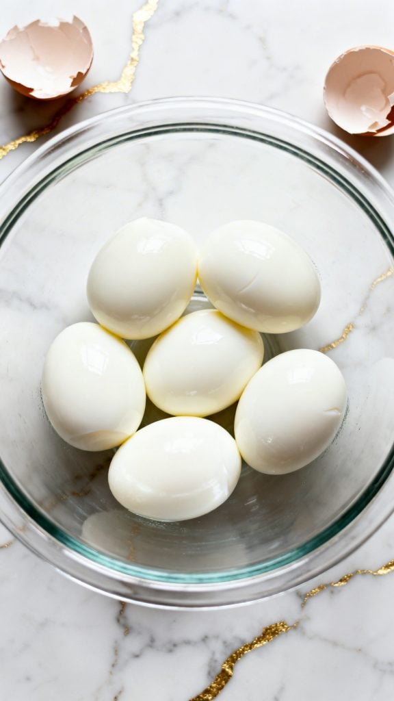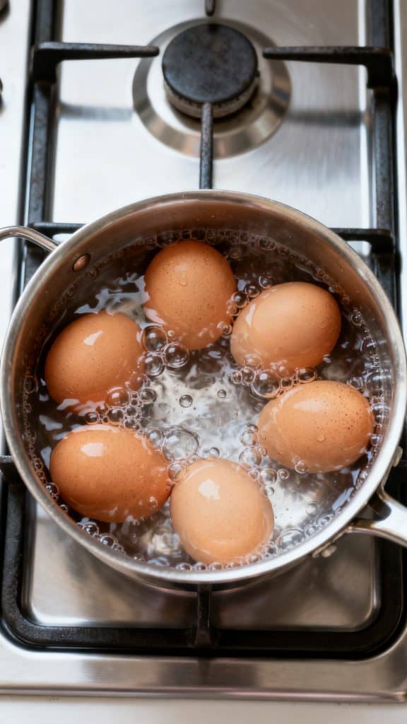 Place 6 eggs in a pot and cover with water. Bring to a boil, then turn off heat and let sit for 10–12 minutes.