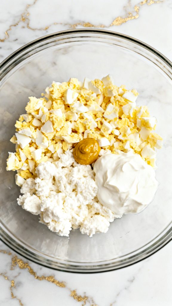 In a bowl, add chopped eggs, 1 cup cottage cheese, 2 tablespoons mayo, and 1 teaspoon Dijon mustard.