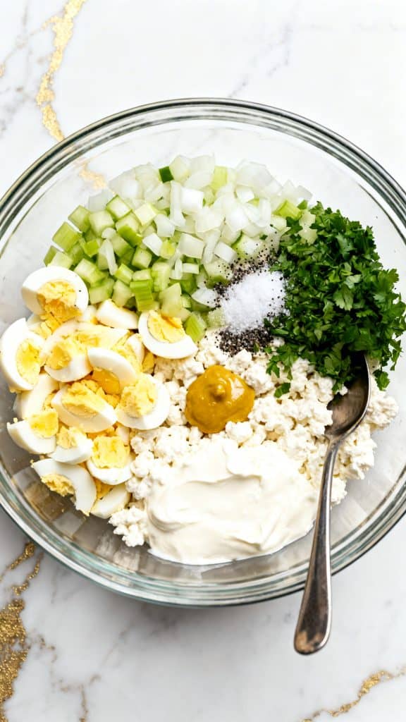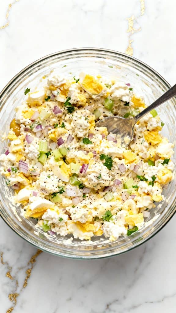 Cottage cheese adds creaminess without needing a lot of fat. The curds hold moisture, so the egg salad stays soft but not greasy. Eggs bring protein and structure, while the mayo and mustard help emulsify everything into a smooth mix.