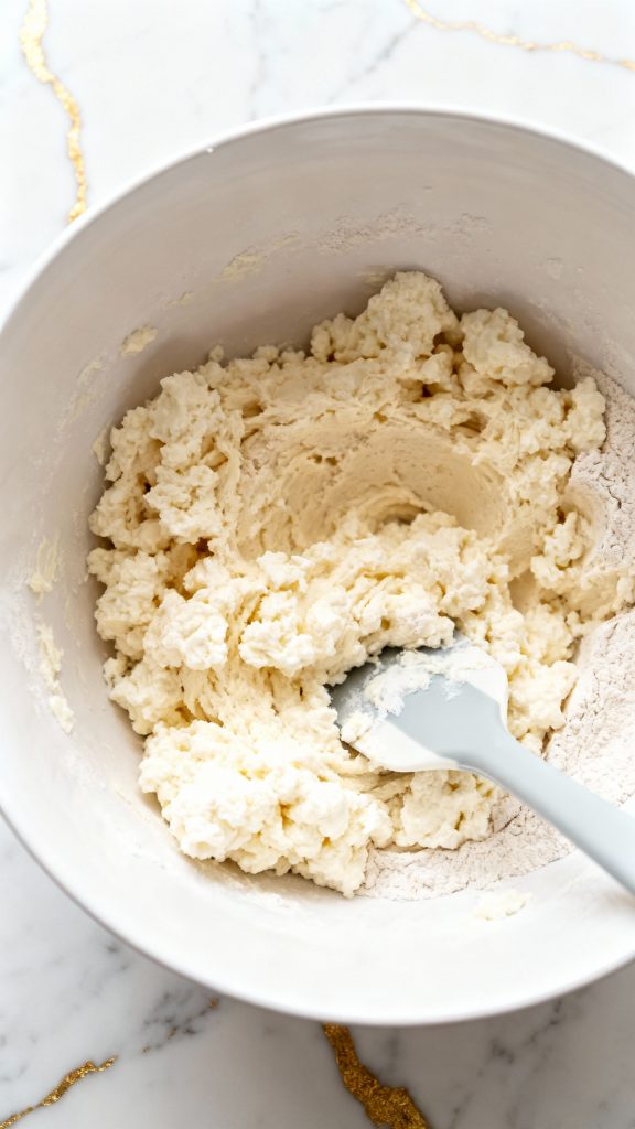Add 1 cup cottage cheese, 1 cup all-purpose flour, 1 tsp baking powder, and ¼ tsp salt to a mixing bowl. Stir everything together with a silicone spatula until it forms a soft, slightly sticky dough.