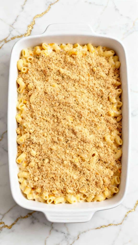 In a small bowl, mix ½ cup seasoned breadcrumbs with 1 tbsp melted butter. Sprinkle evenly over the top of the casserole.
