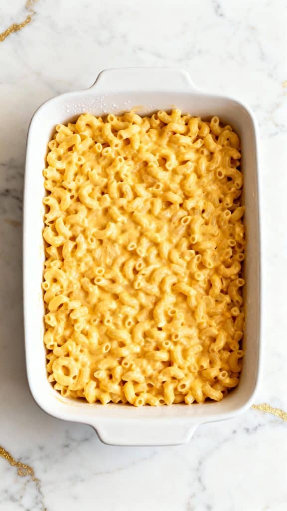 Lightly grease a 9×13 baking dish with non-stick spray or butter. Pour the mac and cheese mixture into the dish and spread evenly.