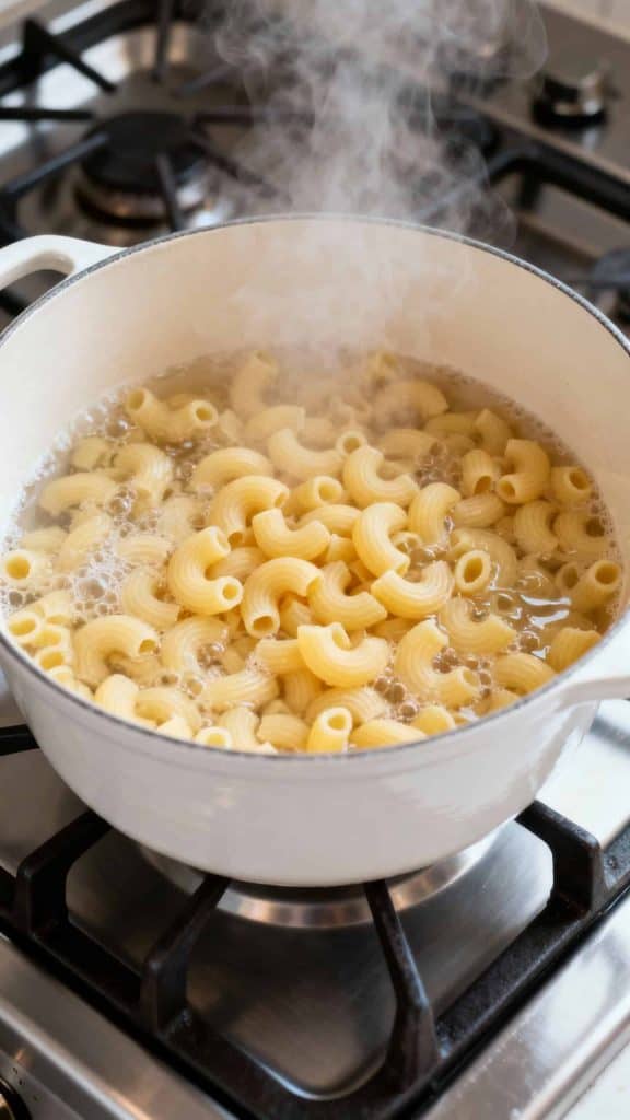 Boil 2 cups elbow macaroni in salted water until just shy of al dente (about 6 minutes). Drain and set aside.