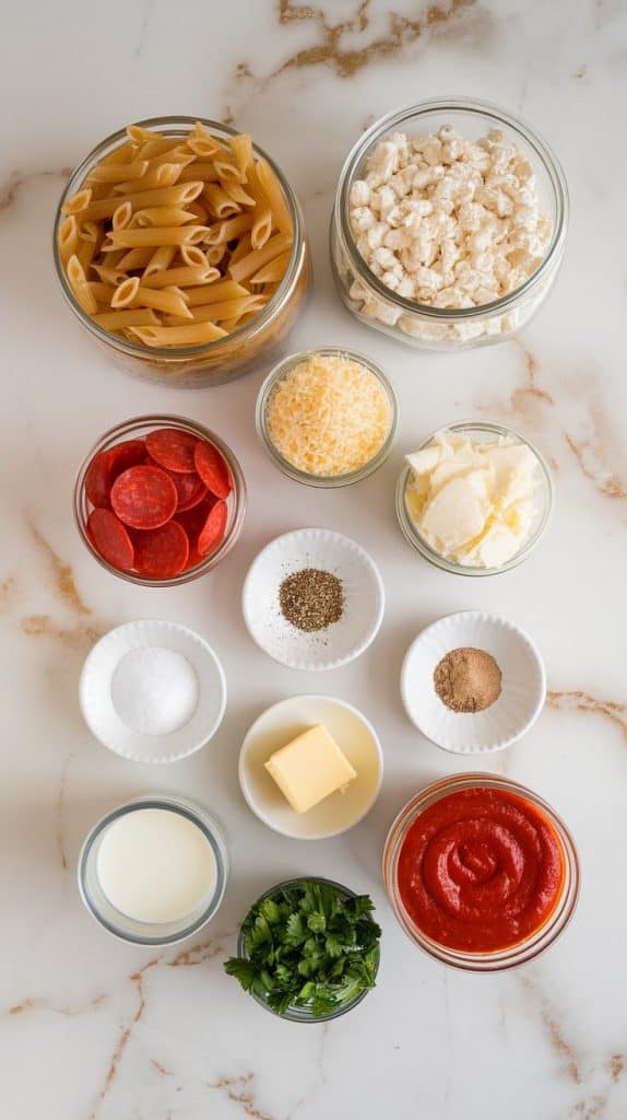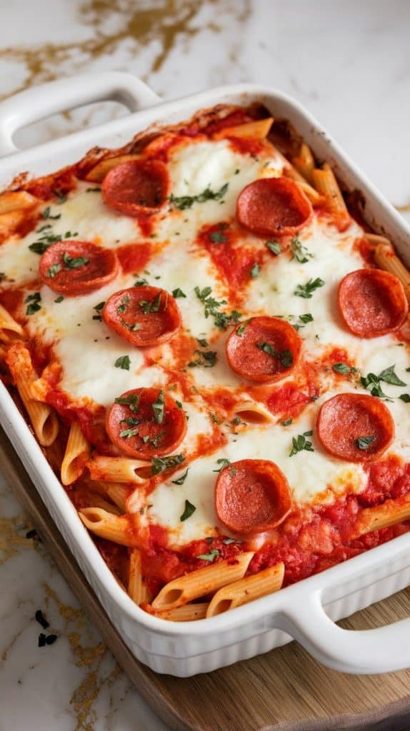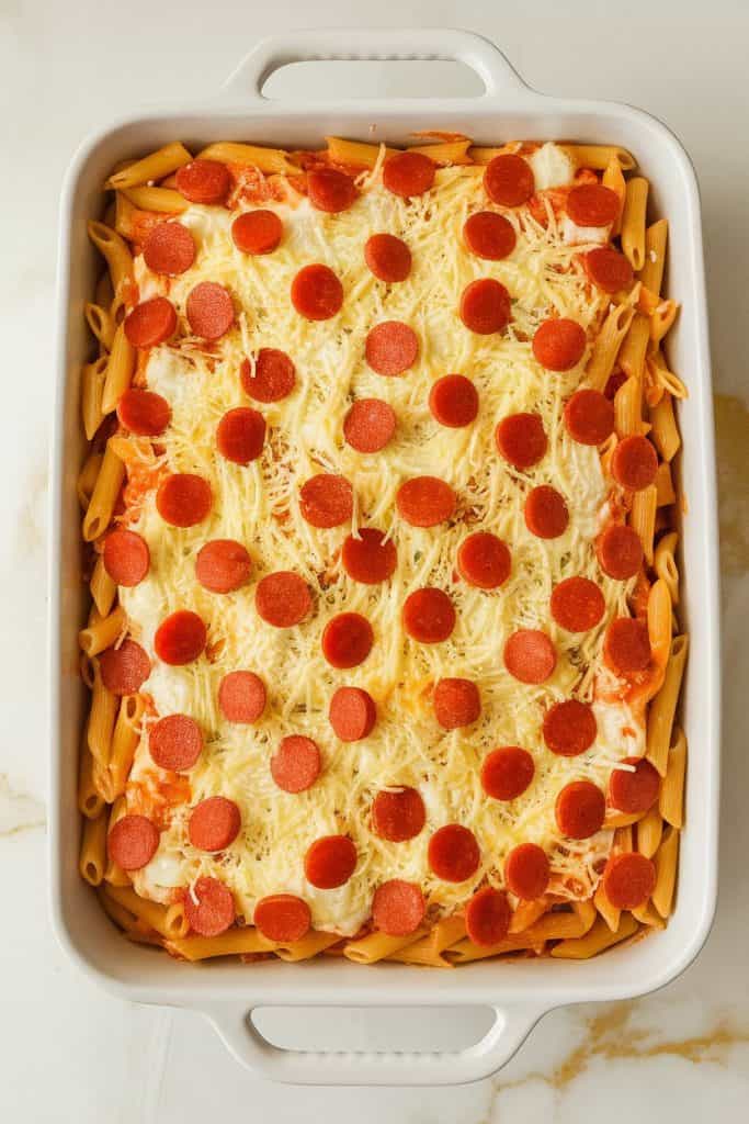 Cottage cheese melts down and combines with milk to make a creamy, protein-rich base. When it bakes with pizza sauce and cheese, it creates a layered flavor that’s tangy, creamy, and cheesy — just like pizza, but with pasta that holds the sauce perfectly. The top layer crisps up from the mozzarella and pepperoni, making every bite taste like a slice.