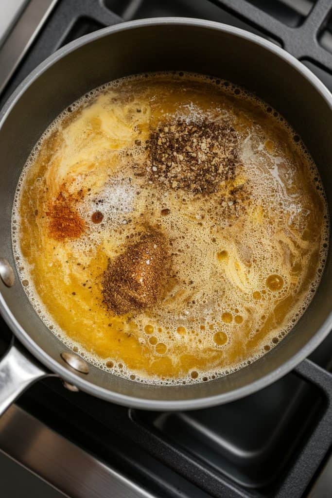 In a small saucepan, melt 2 tablespoons unsalted butter over medium heat. Stir in ½ teaspoon garlic powder, 1 teaspoon Italian seasoning, ½ teaspoon salt, and ¼ teaspoon black pepper.