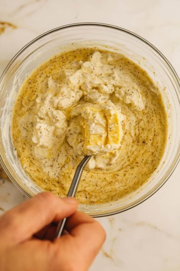 In a large mixing bowl, combine 2 cups small curd cottage cheese, ½ cup whole milk, and the seasoned butter mixture. Stir well until smooth and creamy.