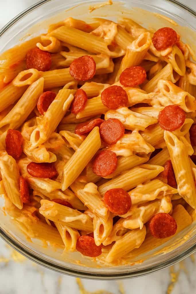 Creamy, cheesy pasta with all your favorite pizza toppings baked into one easy dish.