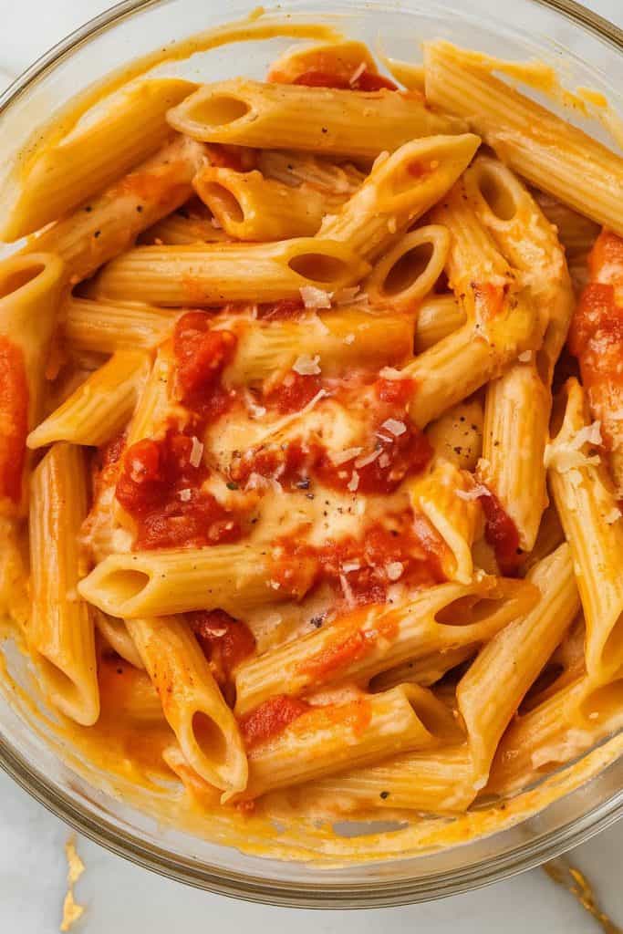 To the same bowl, add 1 ½ cups pizza sauce, ½ cup grated Parmesan, and the drained penne pasta. Stir until everything is coated.