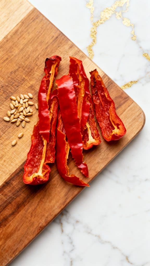 Let the roasted red pepper cool for 5 minutes. Then peel off the skin, remove the stem and scrape out the seeds. Tear the pepper into strips.