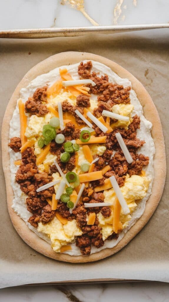 Place the flatbread on the preheated parchment-lined baking sheet. Spread the blended cottage cheese evenly over the flatbread. Top with scrambled eggs, then sprinkle on mozzarella, cheddar, and cooked sausage. Add green onions if you like.