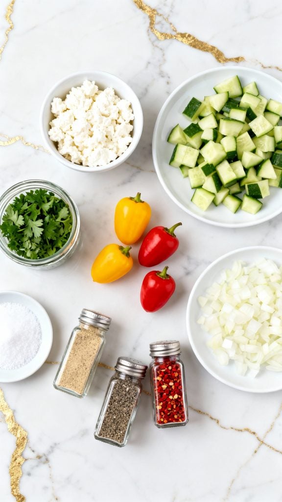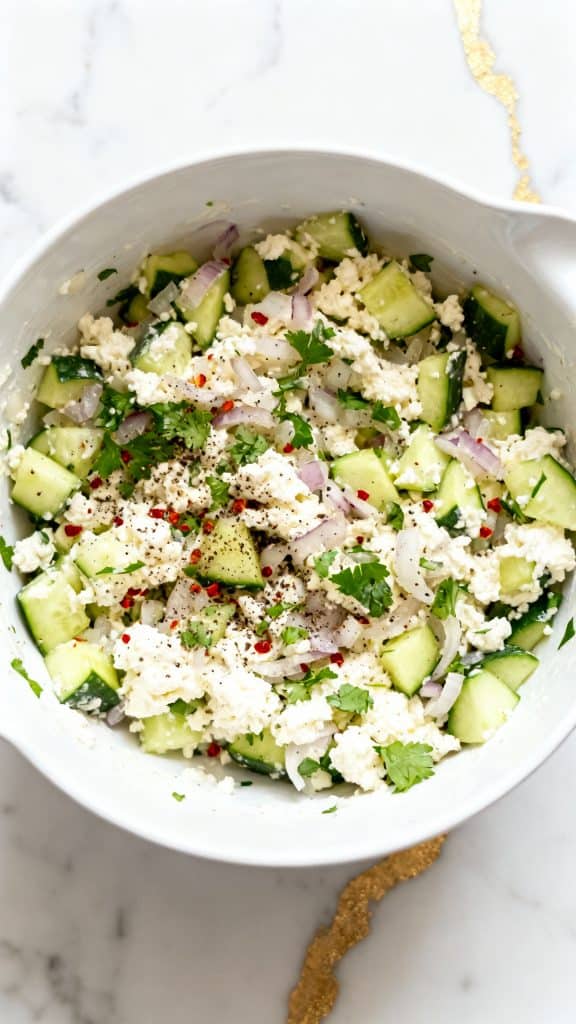 In a mixing bowl, combine 1 cup cottage cheese, the diced cucumber and onion, 1 tbsp chopped parsley, ¼ tsp garlic powder, ¼ tsp salt, ⅛ tsp black pepper, and a pinch of red pepper flakes.