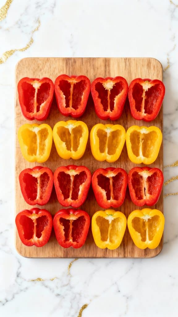 Slice 8–10 mini peppers in half lengthwise and remove any seeds or membranes.