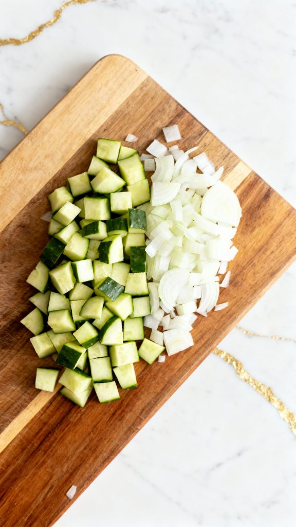Finely dice ¼ cup cucumber and 2 tbsp onion.