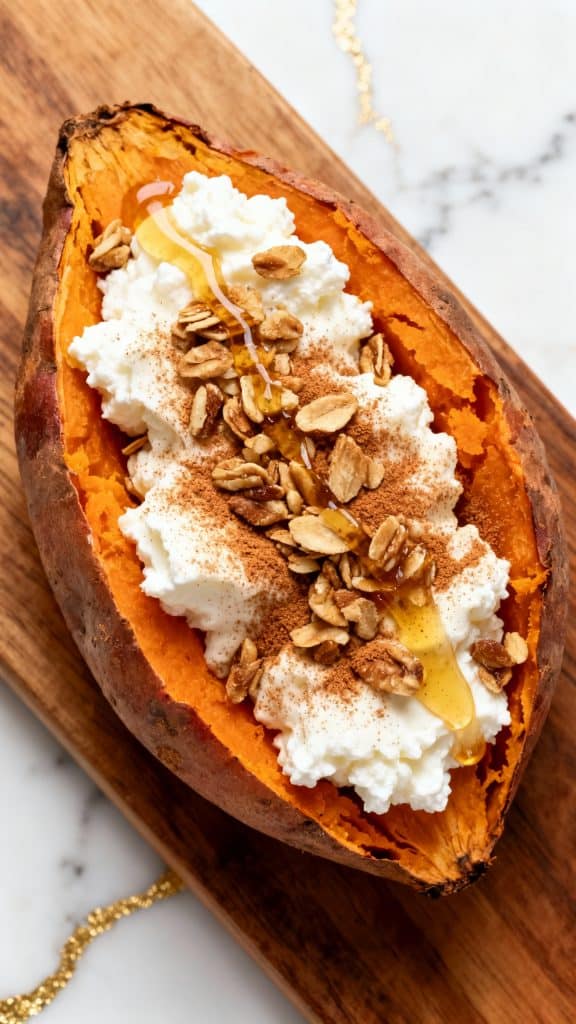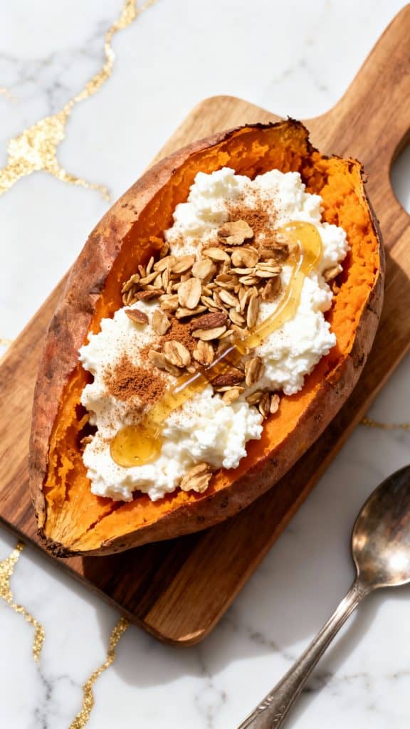 This recipe is my go-to when I want something warm, filling, and easy. You roast a sweet potato, stuff it with creamy cottage cheese, then pile on toppings. It’s a cozy, no-fuss dinner that’s packed with protein and flavor. You can make it sweet or savory—it works both ways.