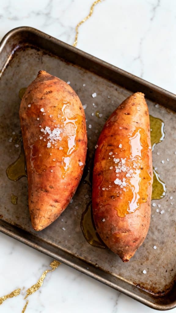 Preheat your oven to 400°F (200°C). Wash 2 medium sweet potatoes and pat them dry. Rub each one with a little olive oil and a pinch of salt. Place them directly on the oven rack or on a baking sheet and roast for 40–45 minutes until fork tender.