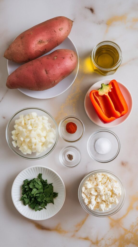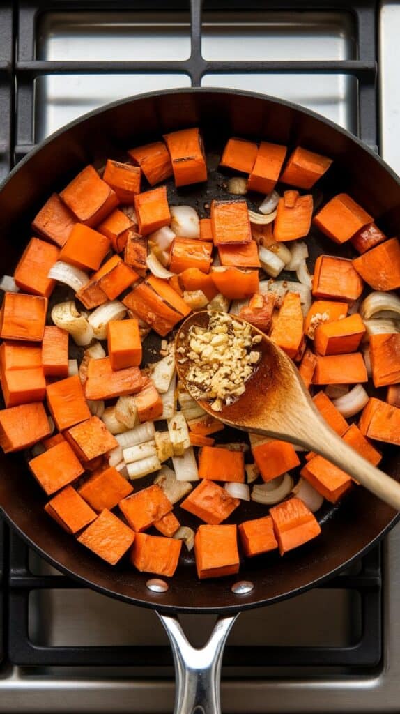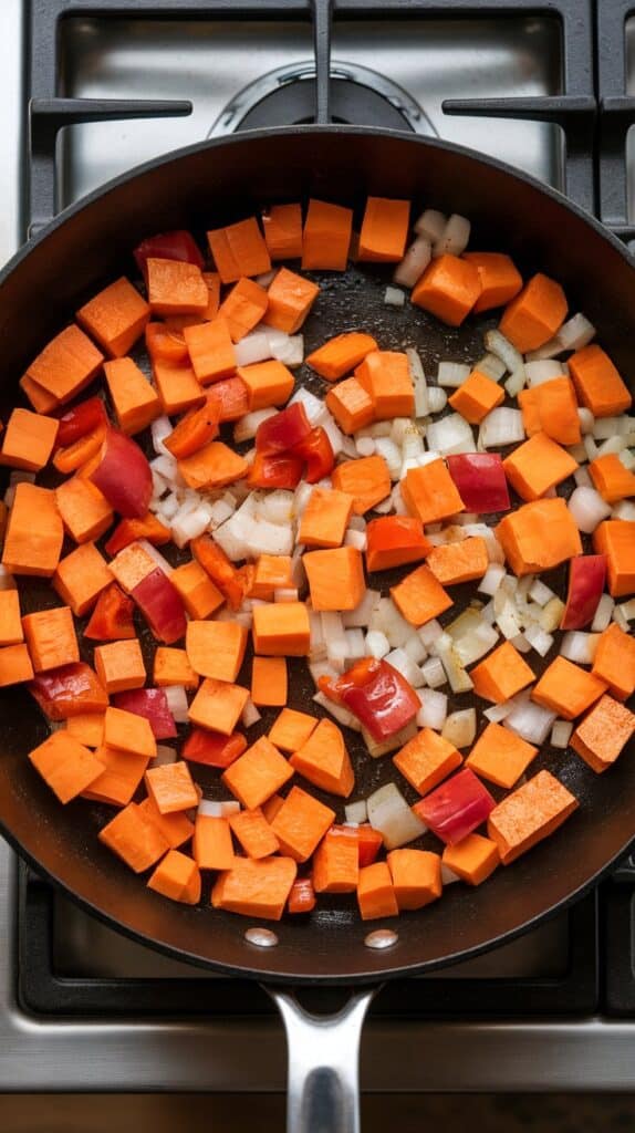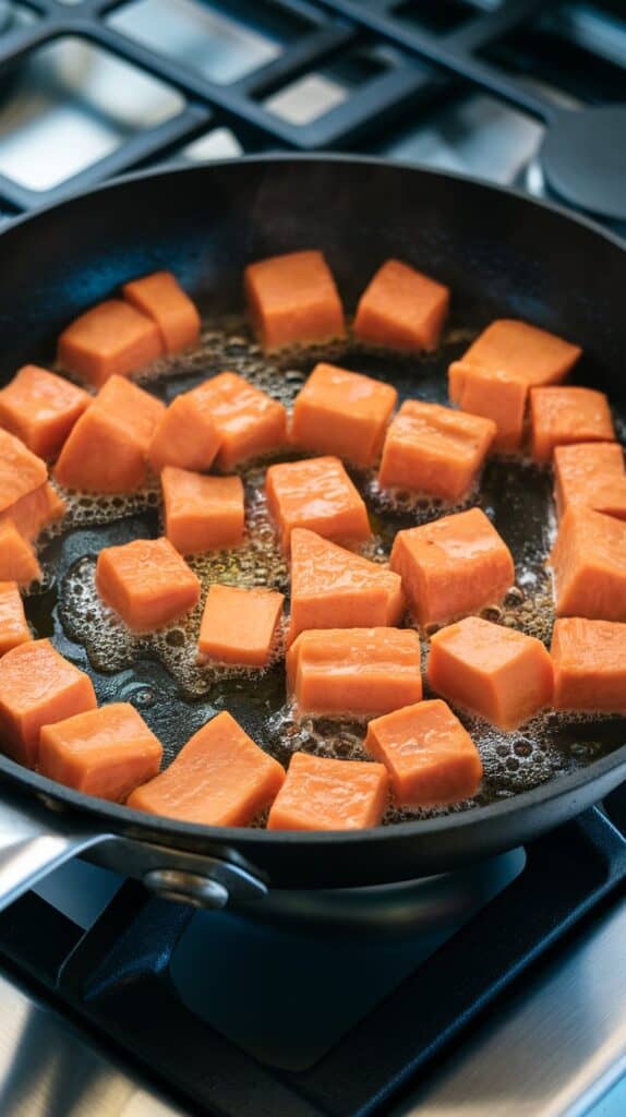 Heat 1 tbsp olive oil in a large skillet over medium heat. Add 2 medium sweet potatoes, peeled and diced into small cubes. Cook for 8–10 minutes, stirring occasionally, until starting to brown.
