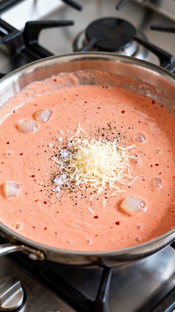 Add the blended cottage cheese to the sauce. Stir in 1/4 cup grated parmesan, 1/2 teaspoon salt, and 1/4 teaspoon black pepper. Simmer for 3–5 minutes.