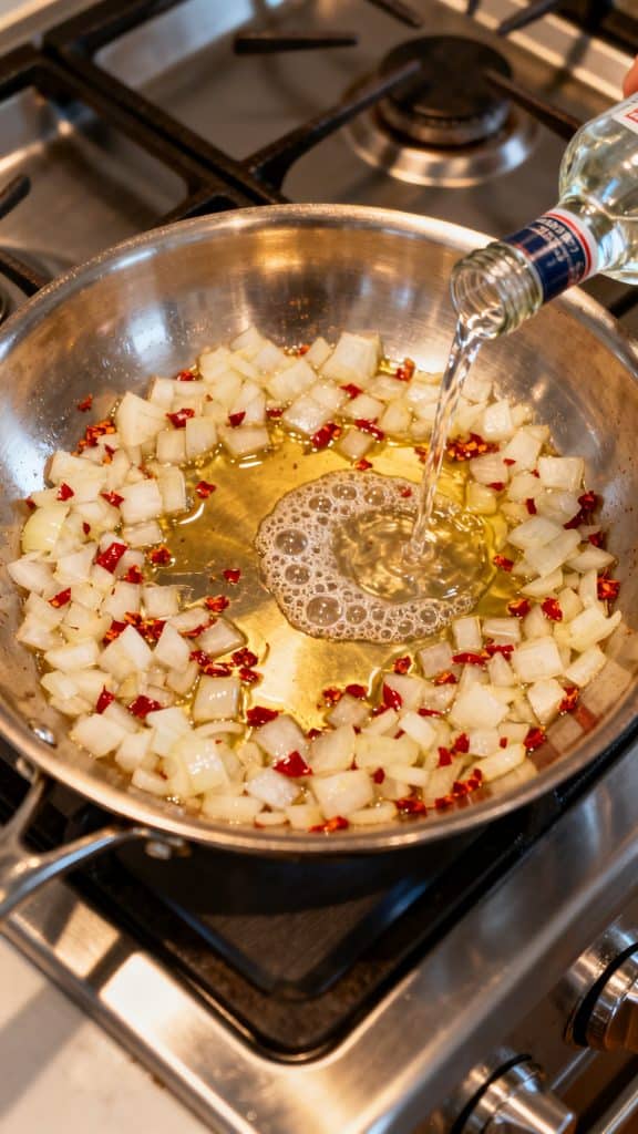 Sprinkle in 1/2 teaspoon red pepper flakes. Pour in 1/4 cup vodka and let it simmer for 2–3 minutes until slightly reduced.