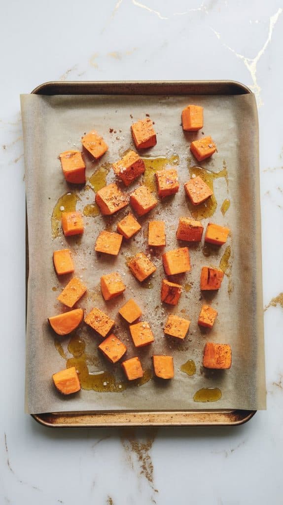 Preheat oven to 425°F. Toss 2 peeled and diced medium sweet potatoes with 1 tablespoon olive oil, ½ teaspoon salt, and ½ teaspoon paprika. Spread evenly on a parchment-lined baking sheet. Roast for 25–30 minutes, flipping halfway, until golden and tender.