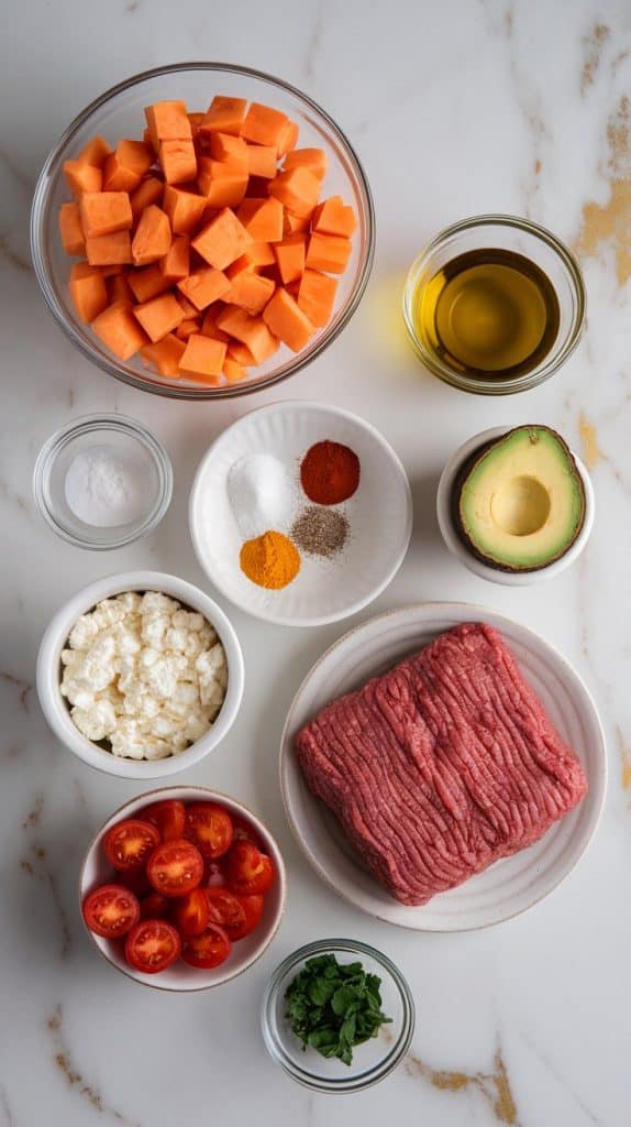 Sweet potatoes give you complex carbs and fiber, which help balance blood sugar and keep you full. Cottage cheese adds a punch of slow-digesting casein protein and creaminess that contrasts the savory beef. Roasting the potatoes caramelizes their natural sugars, while browning the beef adds depth and umami flavor. It’s all about texture and balance.