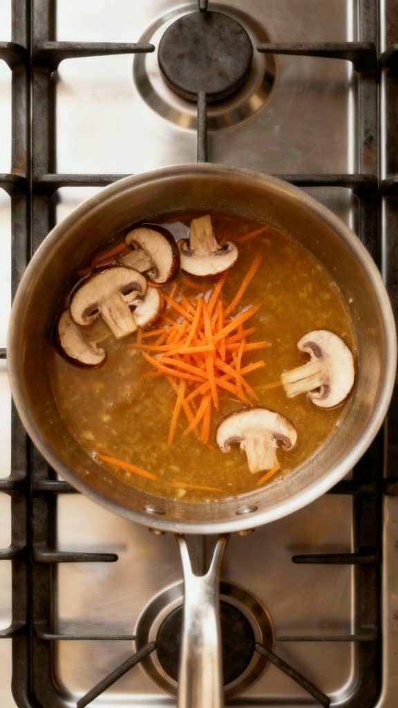 Add 1/2 cup sliced mushrooms and 1/4 cup shredded carrots to the broth. Let them soften for 2–3 minutes.