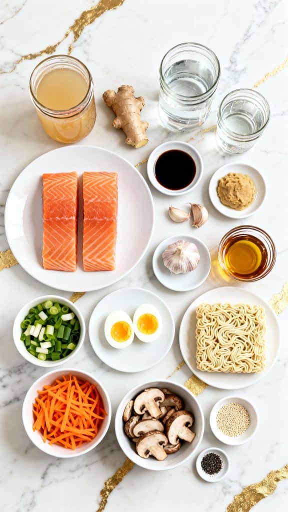 The miso paste and soy sauce give the broth umami depth while sesame oil adds a nutty richness. Cooking noodles separately prevents them from soaking up too much broth. The soft-boiled egg adds creaminess and protein. Combining all these textures—crunchy veggies, soft noodles, flaked salmon—makes it satisfying on every level.