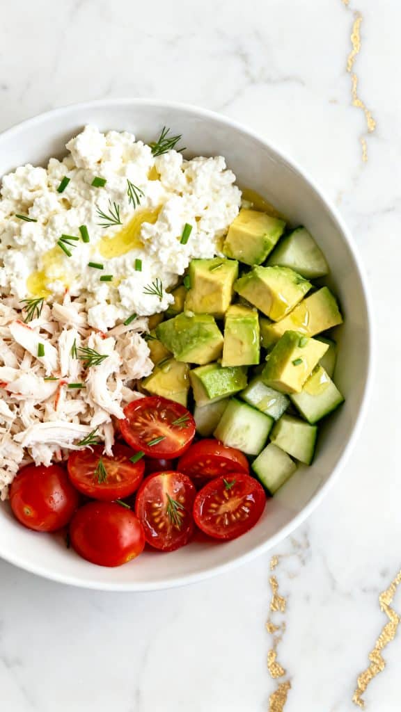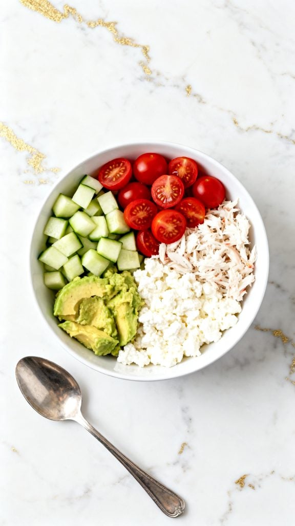 This bowl is one of my favorite quick meals. It came together on a hot afternoon when I had leftover crab from the night before and wasn’t in the mood to cook. I tossed it with cottage cheese for protein, added what was in the fridge, and boom—it became a weekly staple.