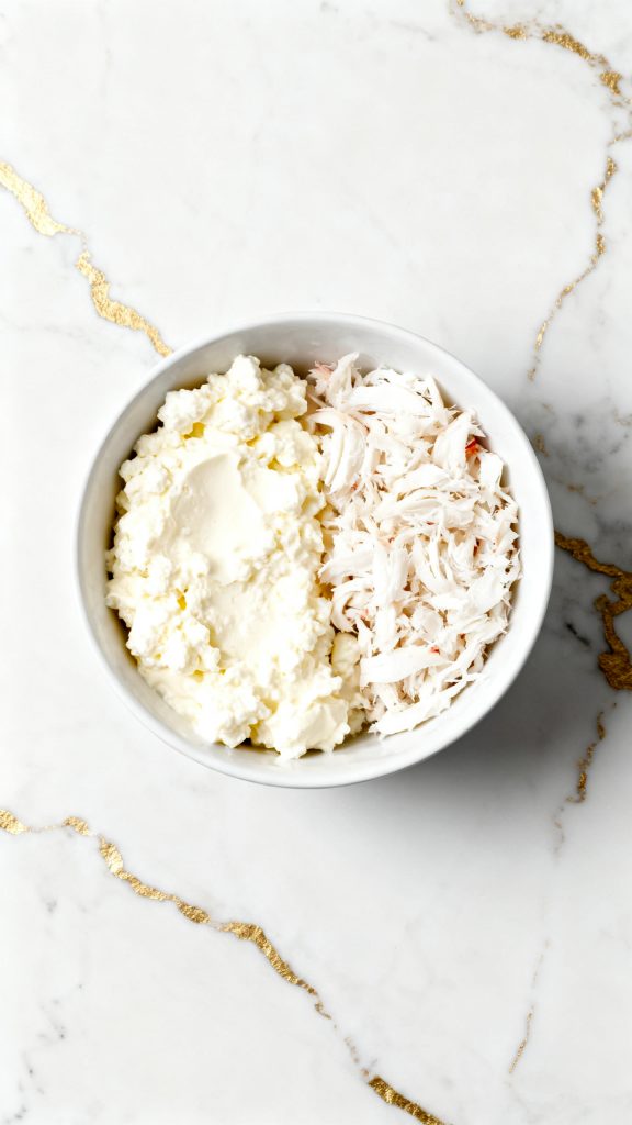 Step 1: Add cottage cheese and crab meat to a bowl