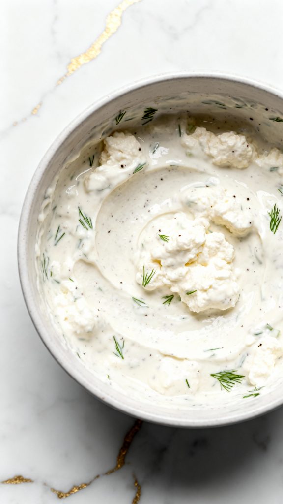 In a large mixing bowl, add 1 cup cottage cheese, ½ cup mayonnaise, ½ packet (1 tbsp) ranch seasoning, 1 tablespoon lemon juice, 2 tablespoons chopped dill, salt, and pepper to taste. Stir until smooth and creamy.