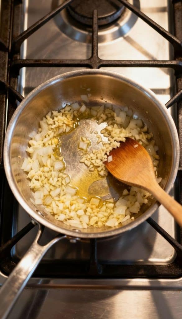 Heat 1 tablespoon oil in a medium pot over medium heat. Add 2 minced garlic cloves and 1/2 small diced onion. Sauté for 2–3 minutes until soft and fragrant.