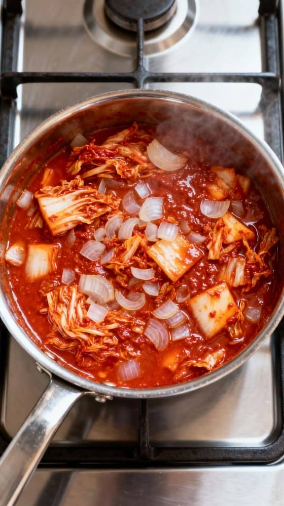 Stir in 1/2 cup chopped kimchi and 1 tablespoon gochujang. Cook for 2 more minutes until the kimchi softens and everything smells amazing.