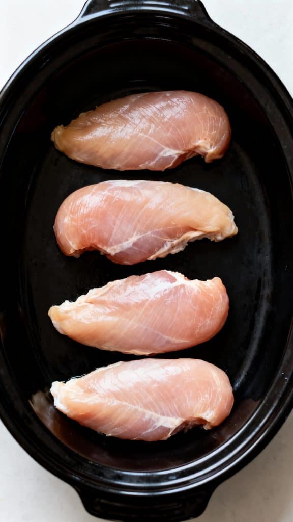 Lay 4 boneless skinless chicken breasts flat into the bottom of your black oval crockpot.