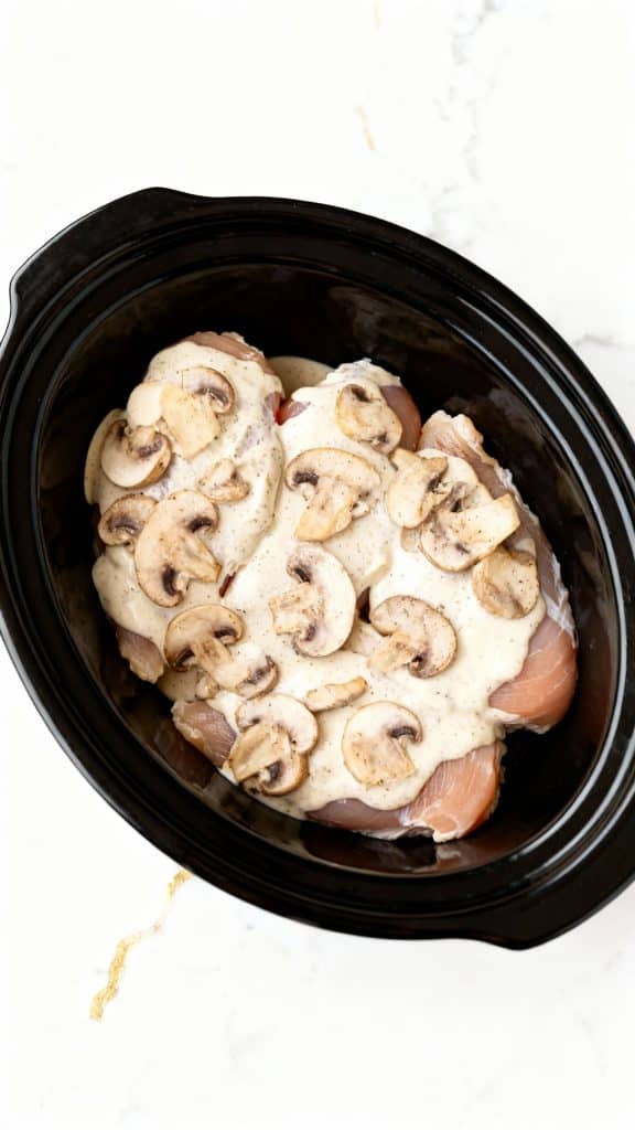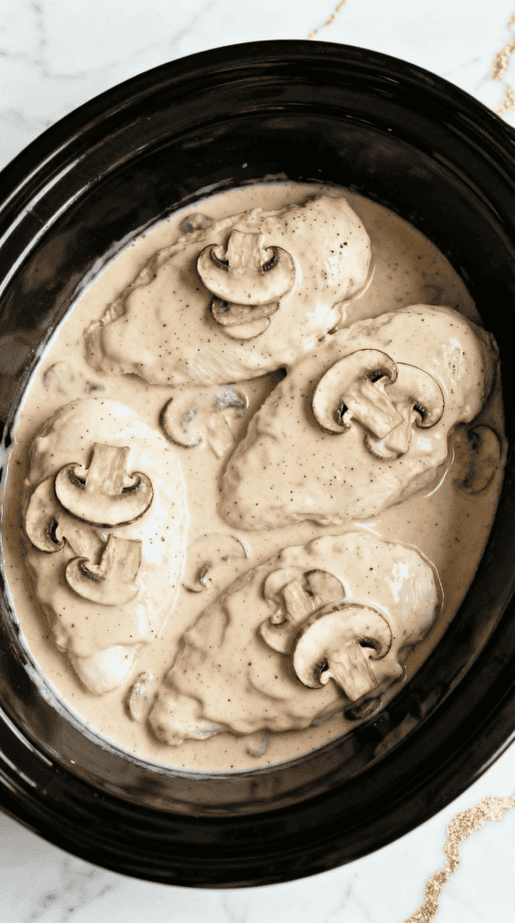 Pour the creamy sauce over the chicken in the crockpot, making sure each piece is fully covered.