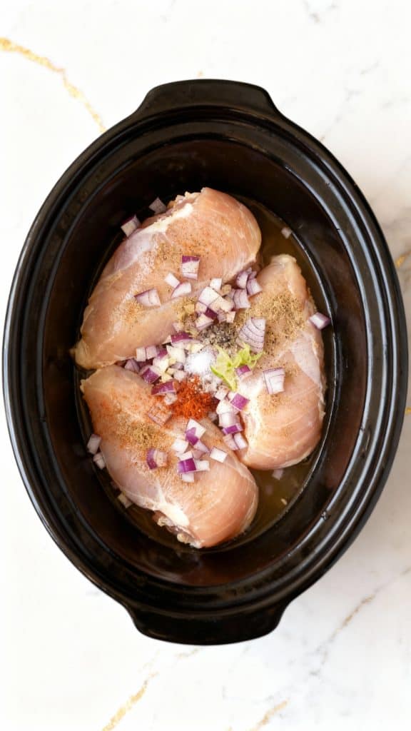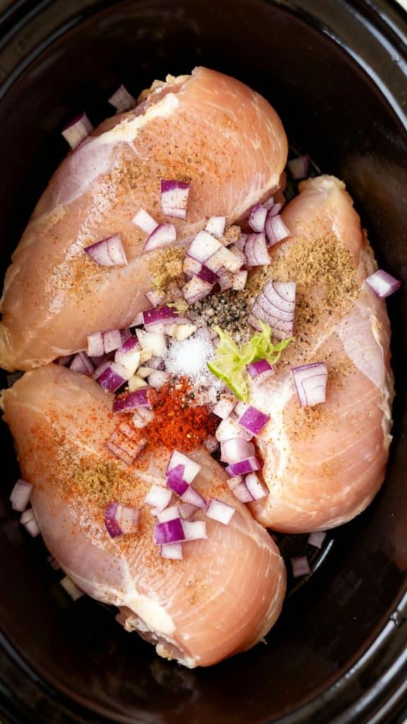 Place 1.5 lbs boneless skinless chicken breasts and ½ diced red onion into the black oval crockpot.