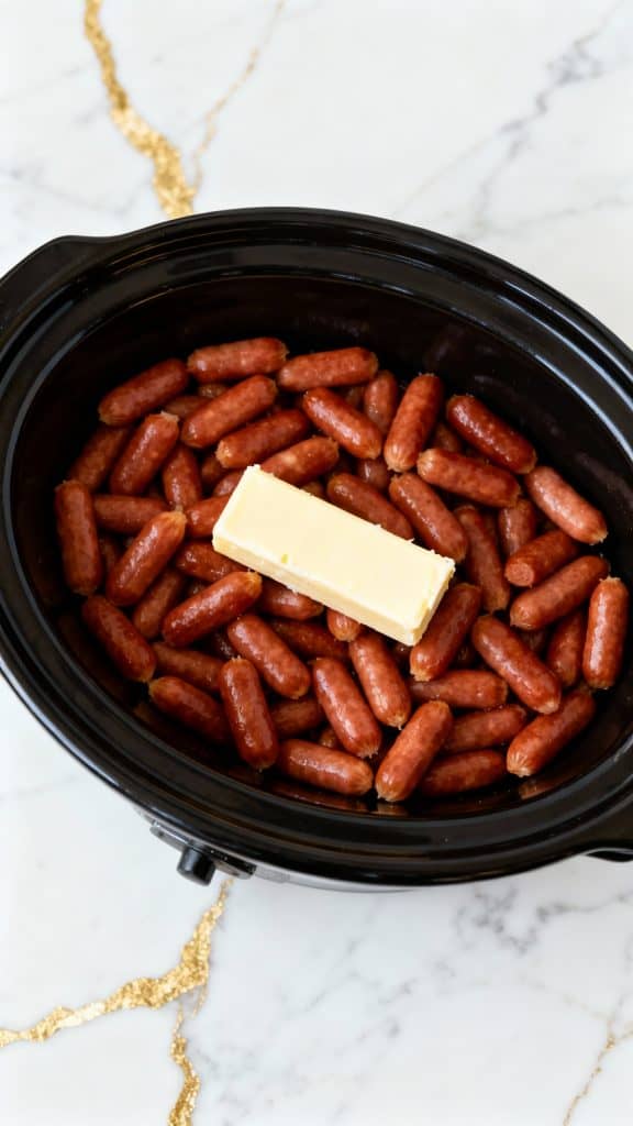 Slice ยฝ cup (1 stick) of unsalted butter into thick pats and place them evenly over the smokies. Donโt worry about melting itโitโll do that in the crockpot.