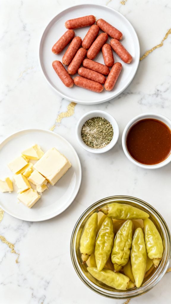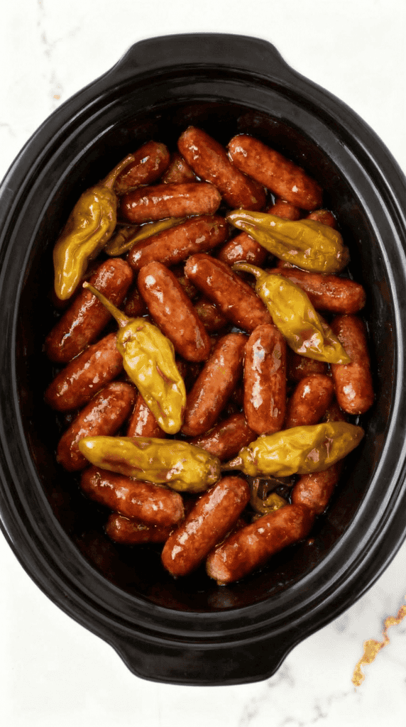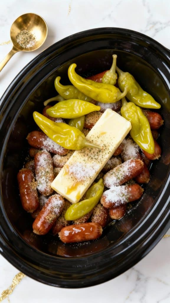 This recipe hits all the flavor notes: fat from the butter, salt and umami from the au jus and ranch, and acid from the pepperoncini juice. Slow cooking melts everything together into a rich, tangy glaze that clings to every sausage. Itโs balance in a pot.