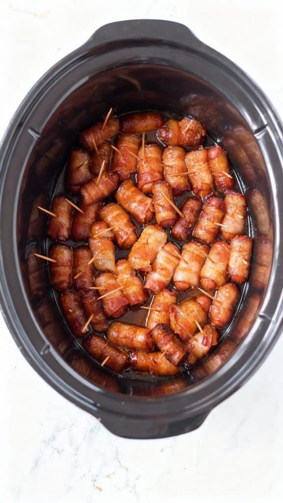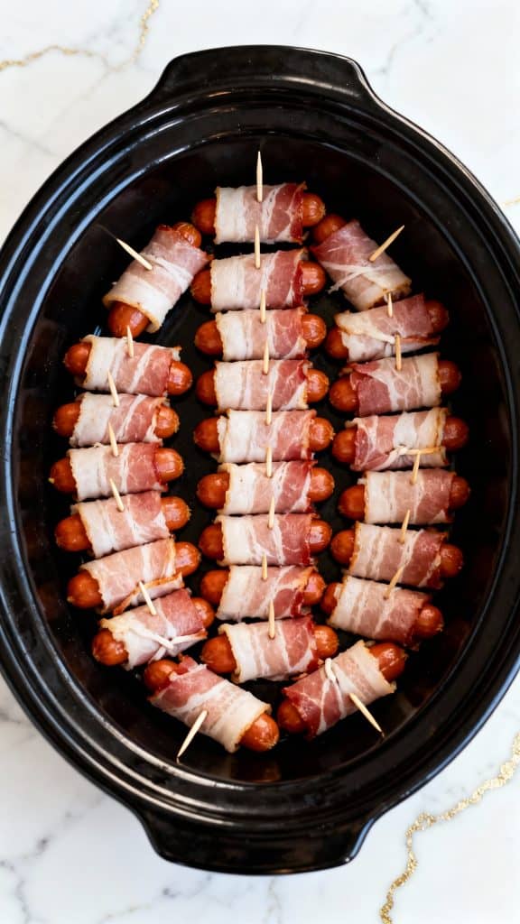 Place the bacon-wrapped smokies in a single layer inside the black oval crockpot.