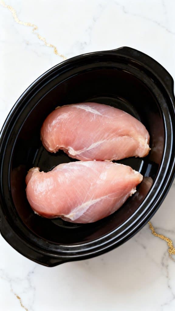 Place 2 pounds of raw boneless, skinless chicken breasts into the black oval crockpot in a single layer.
