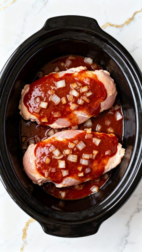 Pour the sauce mixture evenly over the raw chicken breasts, covering them fully. Cover with the lid. Cook on LOW for 4–6 hours or HIGH for 2–3 hours, until the chicken reaches 165°F and shreds easily.