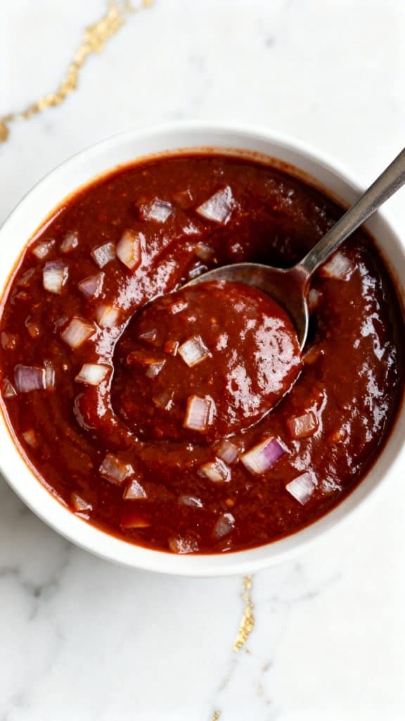 In a small bowl, stir together 1 ½ cups barbecue sauce, ½ cup ketchup, 2 tablespoons brown sugar, 1 tablespoon Worcestershire sauce, 1 teaspoon garlic powder, 1 teaspoon smoked paprika, ½ teaspoon black pepper, ½ teaspoon salt, and ½ cup diced onion. Mix until smooth and fully combined.