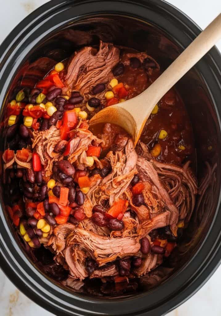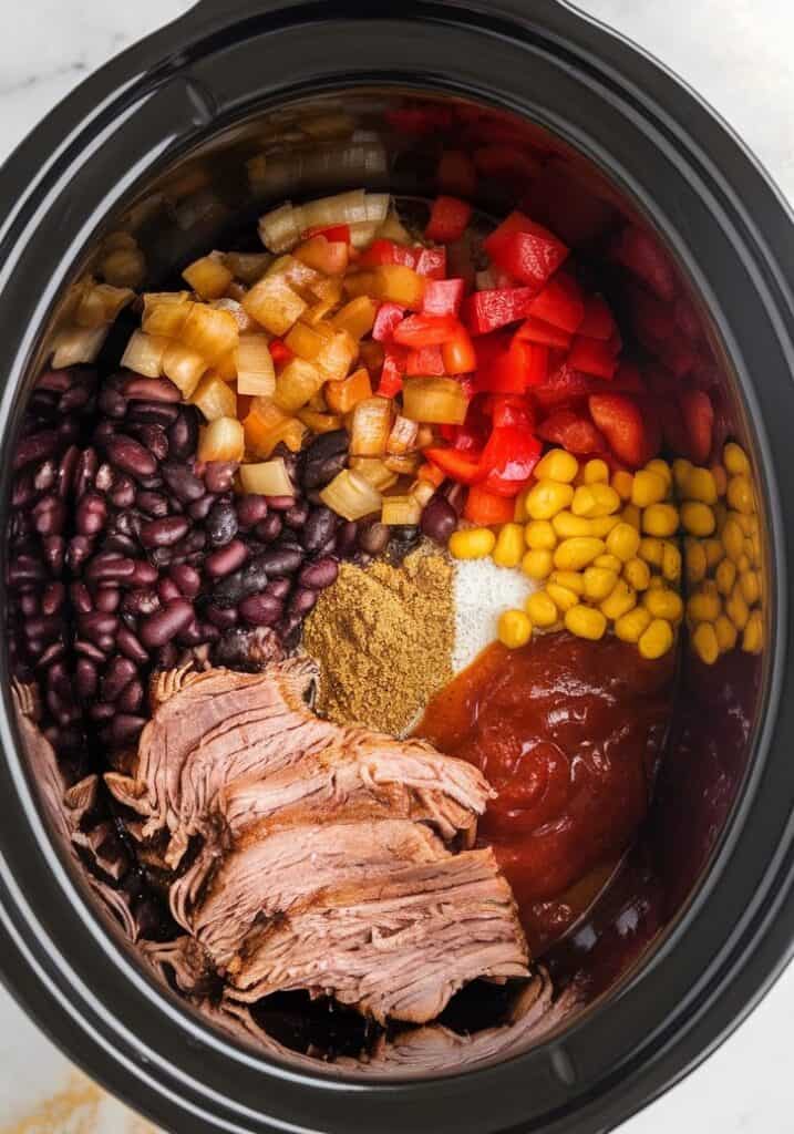 Transfer sautéed veggies into a crockpot. Add 3 cups shredded pulled pork, 1 can black beans (drained), 1 can kidney beans (drained), 1 can corn (drained), 1 can crushed tomatoes (28 oz), 1 cup BBQ sauce, 1 tablespoon chili powder, 1 teaspoon smoked paprika, 1/2 teaspoon cumin, 1/2 cup water, and salt and pepper to taste. Stir everything well.