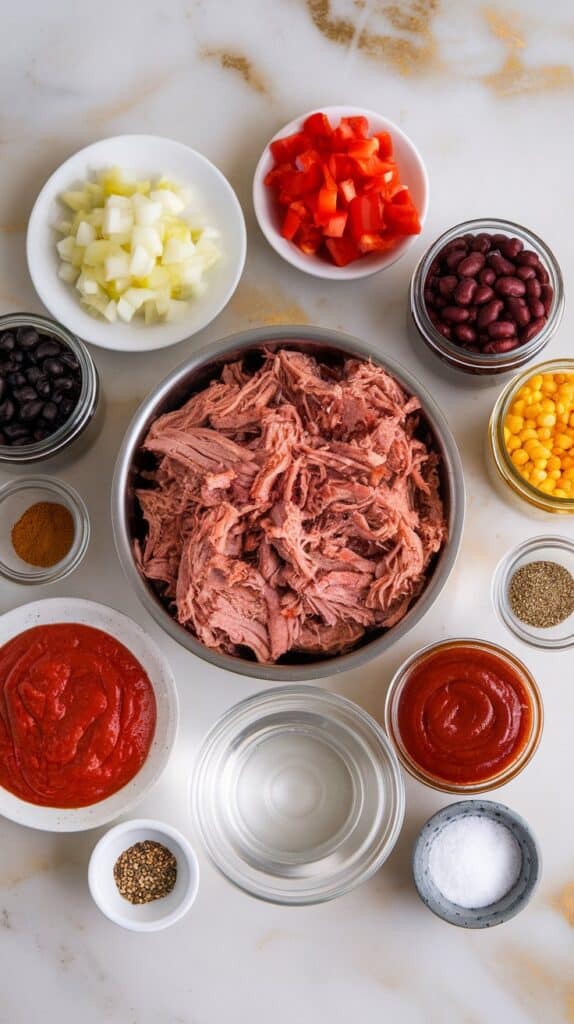 Pulled pork is rich in collagen and fat, which melt into the chili over hours, adding deep flavor. The acidity from tomatoes balances the sweetness from BBQ sauce. Beans and corn hold their shape, giving the dish great texture.