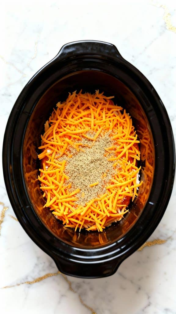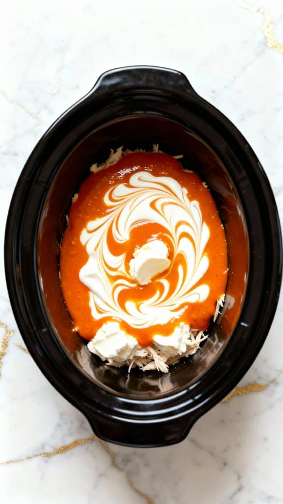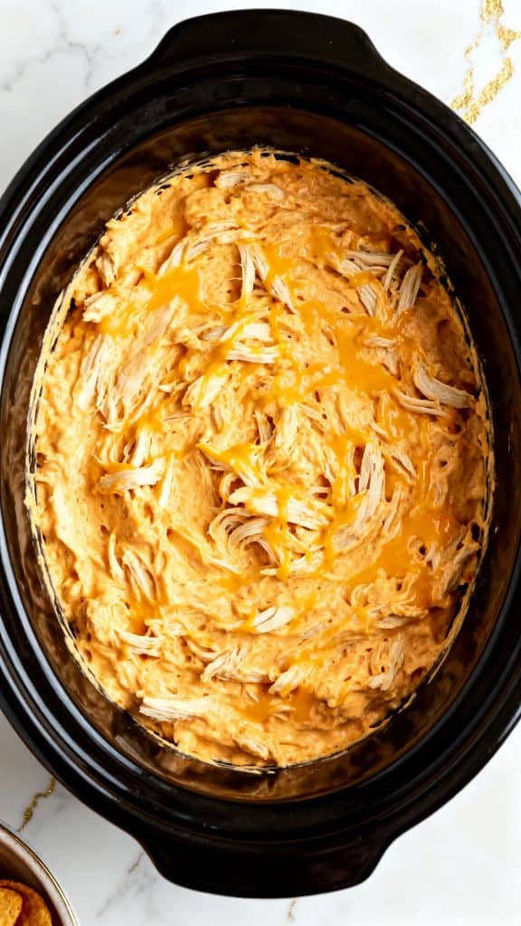 The fat from the cream cheese and cheddar melts together with the buffalo sauce and ranch, creating a super creamy texture that carries the spice evenly through every bite. The shredded chicken soaks in the flavors while staying tender, and cooking it low and slow makes sure everything blends without separating.