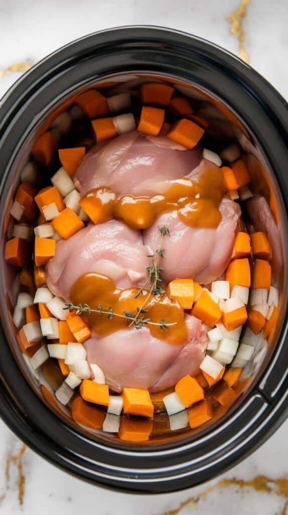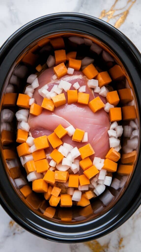 Place 2 pounds boneless, skinless chicken breasts in the bottom of the crockpot. Add 3 cups diced butternut squash and 1 medium diced onion on top.
