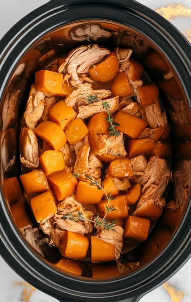 Shred the chicken directly in the crockpot with two forks and stir everything together so the sauce coats the chicken and squash evenly. Serve hot, garnished with fresh thyme.