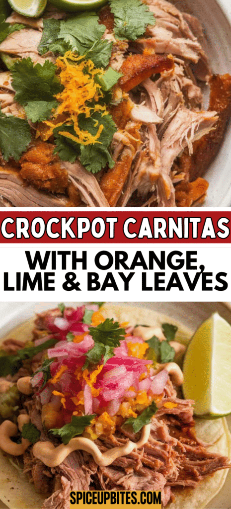 Crockpot carnitas are juicy, tender, and packed with flavor thanks to orange, lime, garlic, and bay leaves. Everything goes in the slow cooker, and you don’t have to fuss with it.